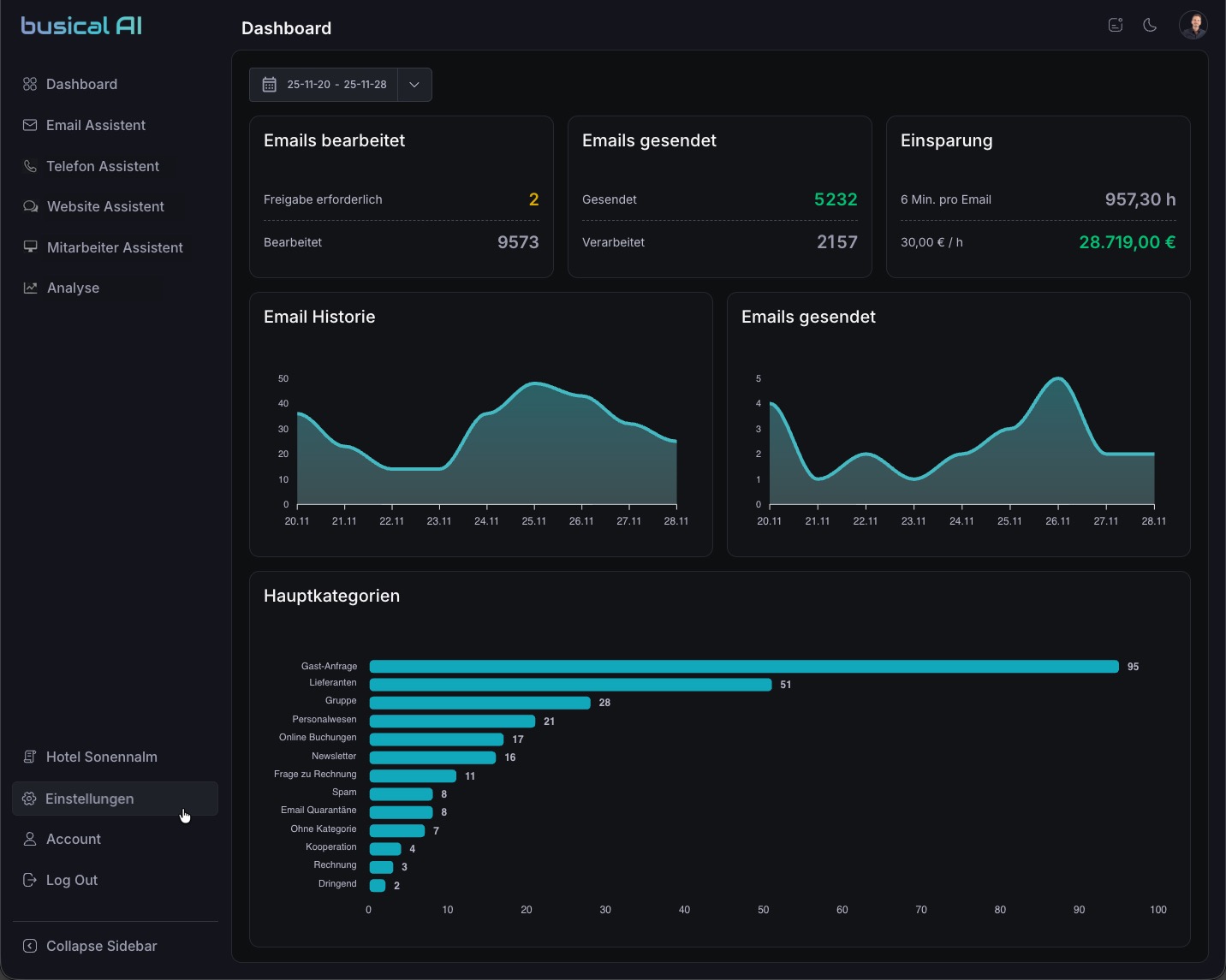 Das übersichtlich aufgebaute Dashboard bietet neben der intuitiven Navigation, die zu den einzelnen Assistenten und den Einstellungen führt, zugleich einen detaillierten Überblick über den aktuellen Status und notwendige Freigaben von E-Mails-Entwürfen.